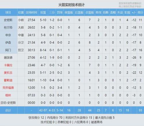 火箭打成这样,肯定不是杜兰特自己的问题。火箭首发中锋申京投篮8中5,三分1中0,罚球4中0,仅得10分2篮板3助攻3盖帽,正负值-17。大中锋只抢到2个篮板球,更扎心的是罚球4中0。火箭全队罚球14中5,罚球命中率35.7%。